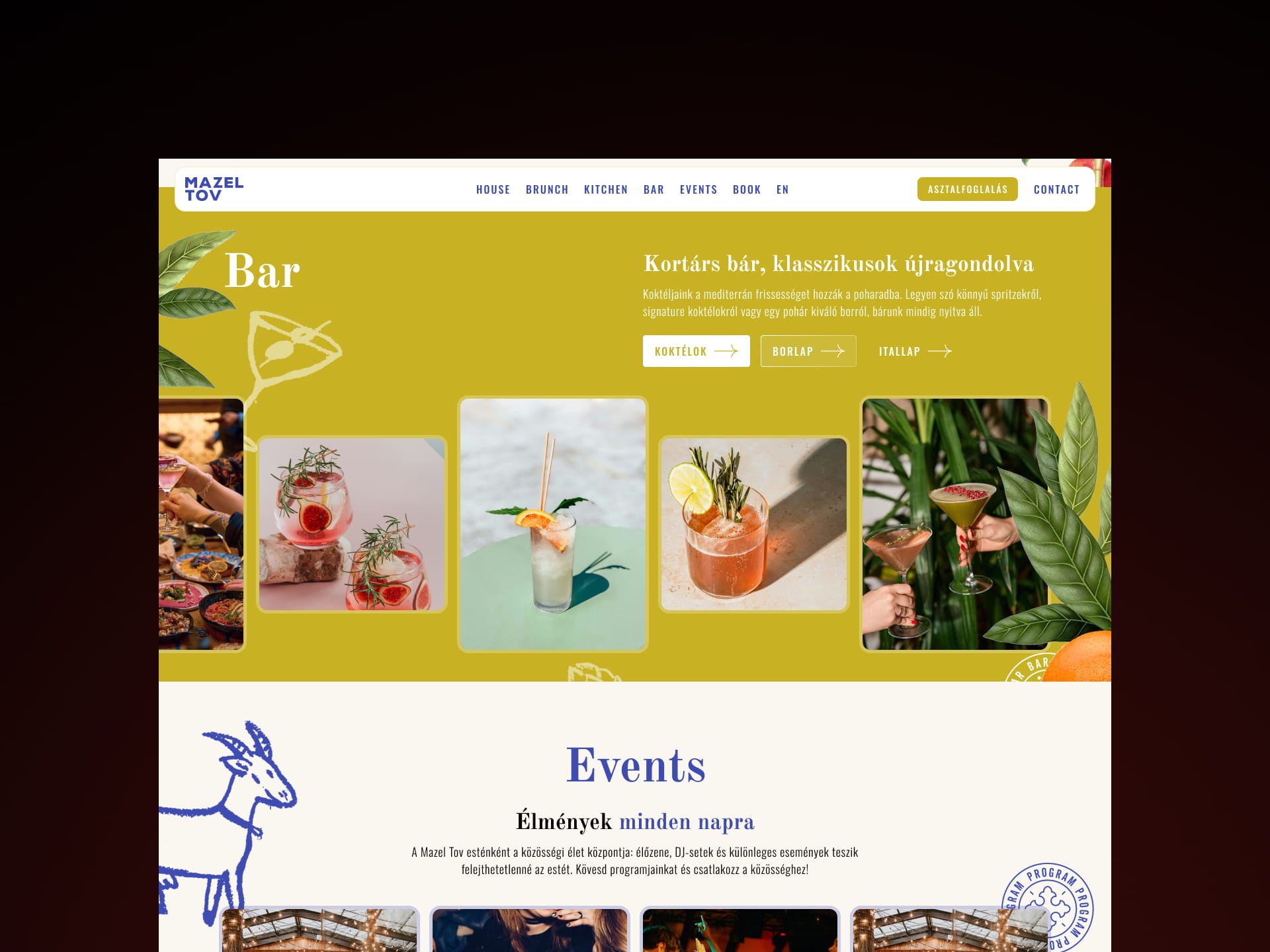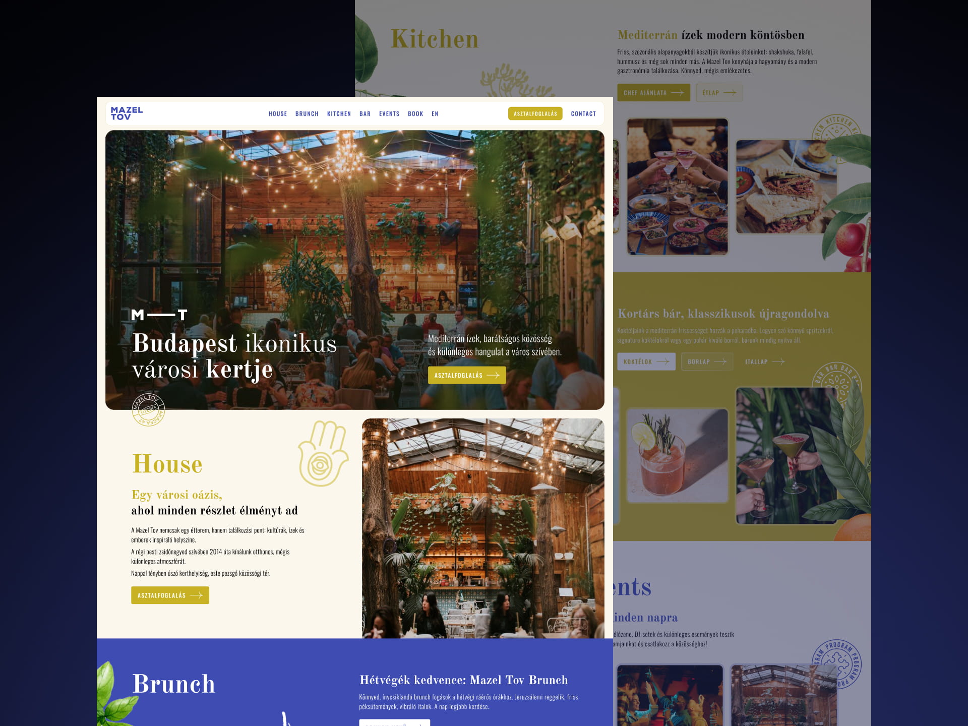 Mazel Tov is a restaurant and cultural venue website designed to capture the unique atmosphere of one of Budapest’s most iconic hospitality spaces. Located in the heart of the city’s Jewish Quarter, the venue combines gastronomy, community, and events in a vibrant, garden-like setting.